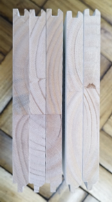 Las cinco muestras analizadas se presentan como trozos de madera, pintados de color blanco en sus caras (imagen N°1) y cantos (imagen N°2), con dimensiones de 18,5 cm de ancho, 30 cm de largo, 1,6 cm de espesor y terminaciones machihembrado para realizar uniones entre si (imagen N°3).